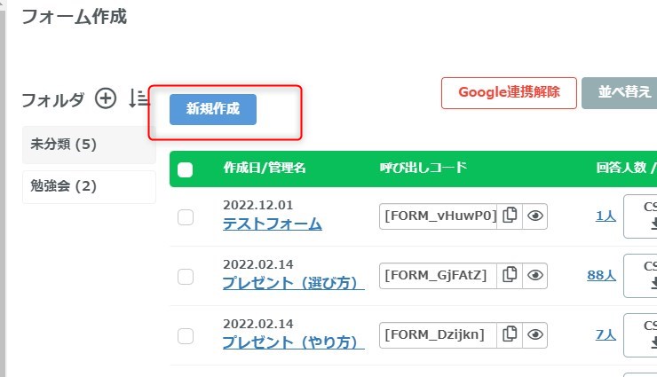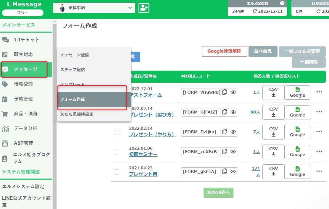 メッセージ>フォーム作成をクリックします。