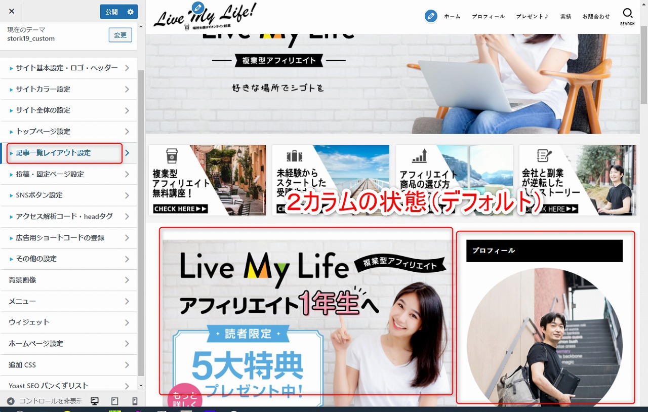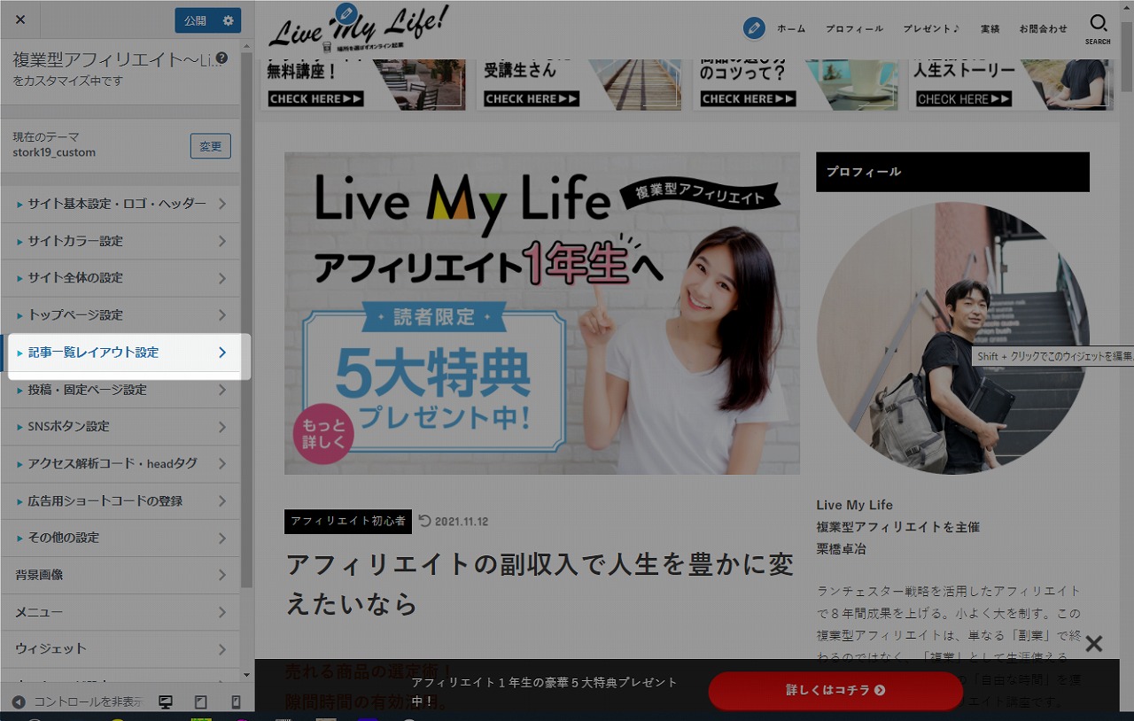 カスタマイズから記事一覧レイアウト設定をクリックします。