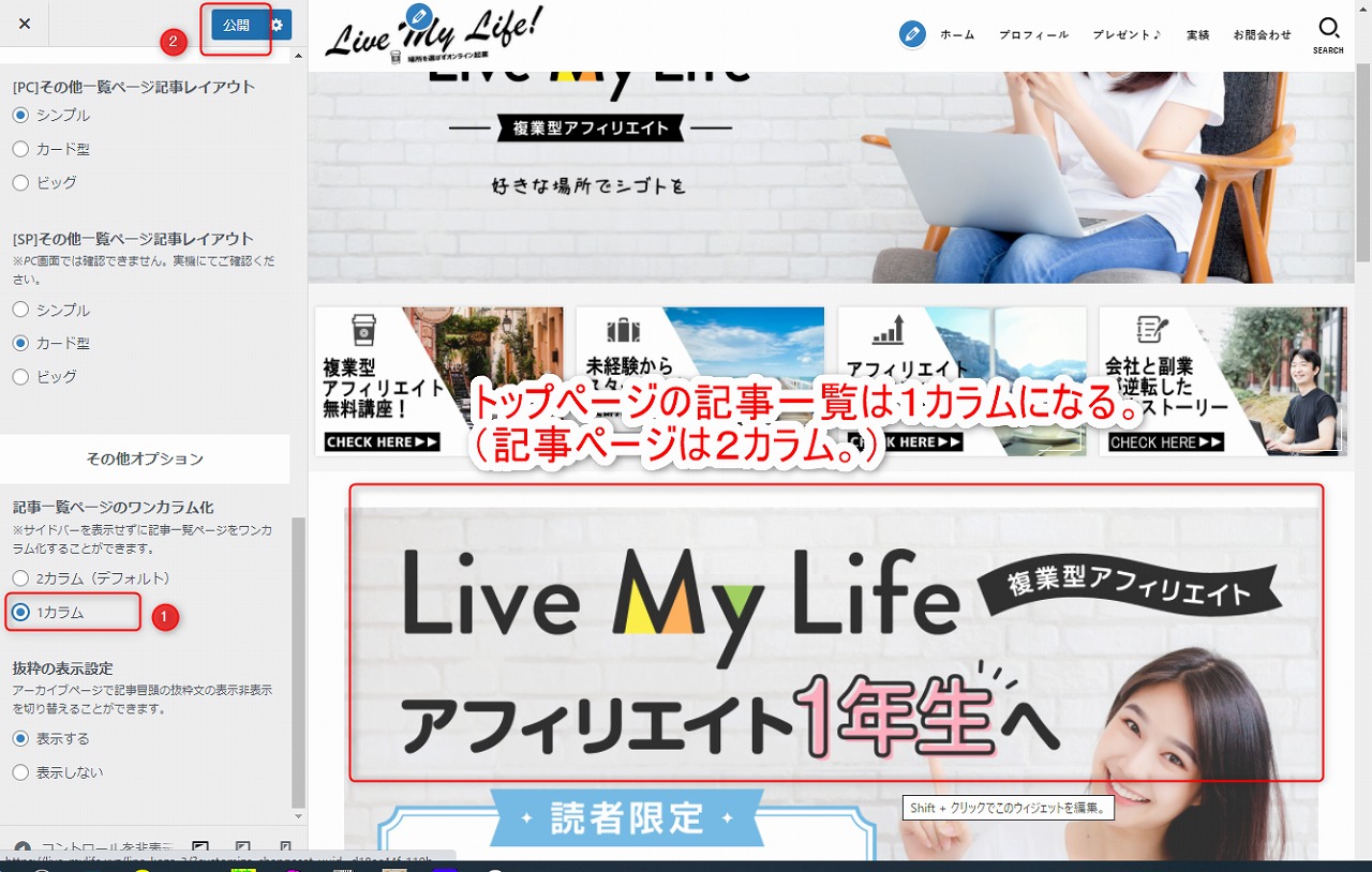ここでは、トップページのカラムを2カラムから1カラムに変更する方法をご紹介します。